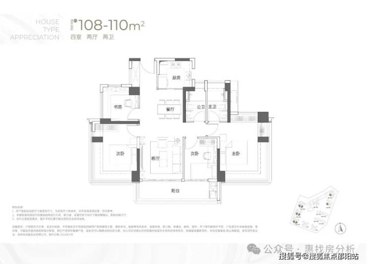 108-110㎡的4房2厅2卫:竖厅双龙抱珠格局,客厅开间3.5米,LDKB一体化,4个卧室分别做到了3.7米/3.4米/2.8米/2.6米的宽度,主卧加2个次卧270°全景飘窗,客厅连接次卧出6.1米长的大阳台,U型厨房,得房率约95-97%(包含赠送),西南或东南朝向。户型分布在1栋1/2/3单元03/04户型,03户型东南朝向,04户型西南朝向;只有2栋2/3单元看小区,其他都看向小区外部;