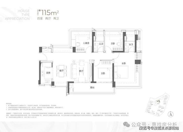 115㎡的4房2厅2卫:横厅南北通透格局,客餐厅6米开间,LDKB一体化,全屋飘窗,4个卧室分别做到了3.9米/3米/2.8米/2.6米的宽度,主卧加1个次卧270°全景飘窗,客厅出6米长的大阳台,L型厨房,得房率约95-97%(包含赠送),西南或东南朝向。115平米户型分布在1栋1单元、1栋2单元、1栋3单元01/02户型,01户型西南朝向都是看小区外围,02户型看向小区;
