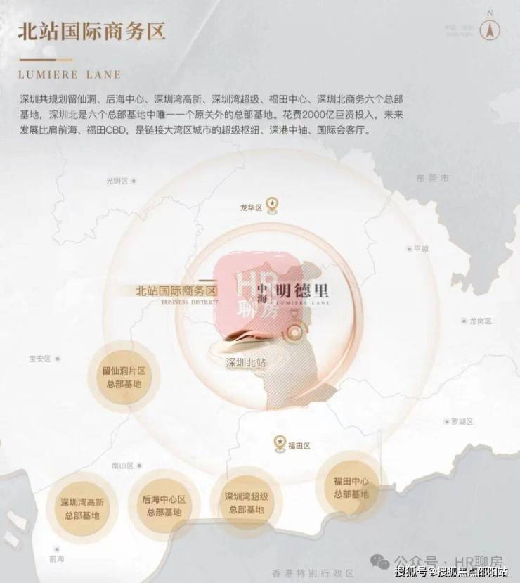 2)北站国际商务区,深圳六大总部基地之一,高投入打造国际化城市会客厅;项目距离深圳北站直线约2公里,所在民治街道是龙华目前发展的核心区域;