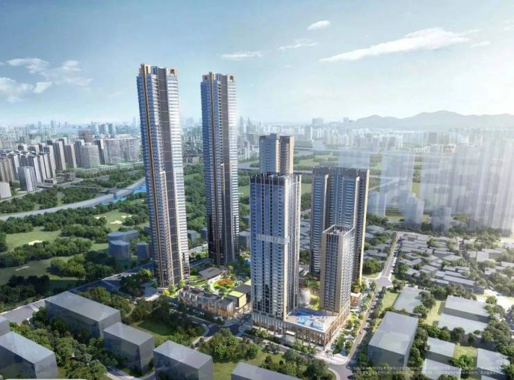 整体分两期开发建设,其中:项目一期东地块包含1栋酒店+商务公寓、1栋保障房、2栋包含一、二单元的住宅;西地块包含2栋高约250米的超高层住宅,另有1栋约50层高的商务公寓。