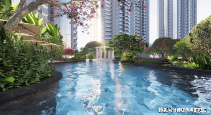 园林请的是新加坡团队设计,度假风满满,约4000㎡的空间里泳池、阳光草坪、休闲吧台、童趣乐园、康养中心全部配齐。