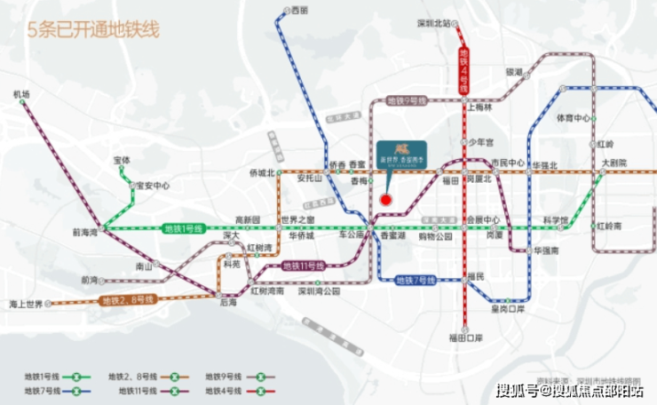 双地铁口,1号线香蜜湖站步行约500米,9号线香梅站步行约640米。在这两个站点乘车1-2站可达车公庙、景田、购物公园、会展中心换乘站,便捷换乘2/8号-3号-4号-7号-11号线。1.5公里范围内有深南大道、香蜜湖路、新洲路等城市主干道,深南大道连接罗湖、福田、南山、前海核心区,自驾出行也非常方便。另外,项目步行1200米可达地铁五期在建的22号线香蜜西站。22号线誉为"科技金融大动脉",直连香蜜湖新金融中心与河套两大引擎。