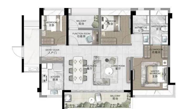 建面约125平3+1房,做了横厅设计,客厅和阳台都相对大气很多,主套也同样有一个270度的飘窗。