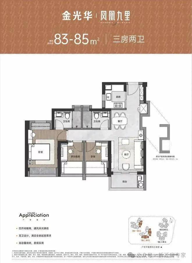 85㎡的3房2厅2卫(01.07户型),设计的是竖厅南北通透格局,主卧双飘窗设计,U型厨房,客厅阳台主朝西北、东北向。