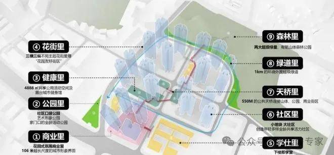 整个项目以双慢行道、两处公园、三重休闲、五大花街景轴打造超级绿量慢行道系统赋氧公园大城。并以“一轴两公园三中心”概念,匠筑约500m大城的立体城市连廊系统,无缝串联全龄教育、精致商业、品质人居、活力运动、公园休闲等功能板块。