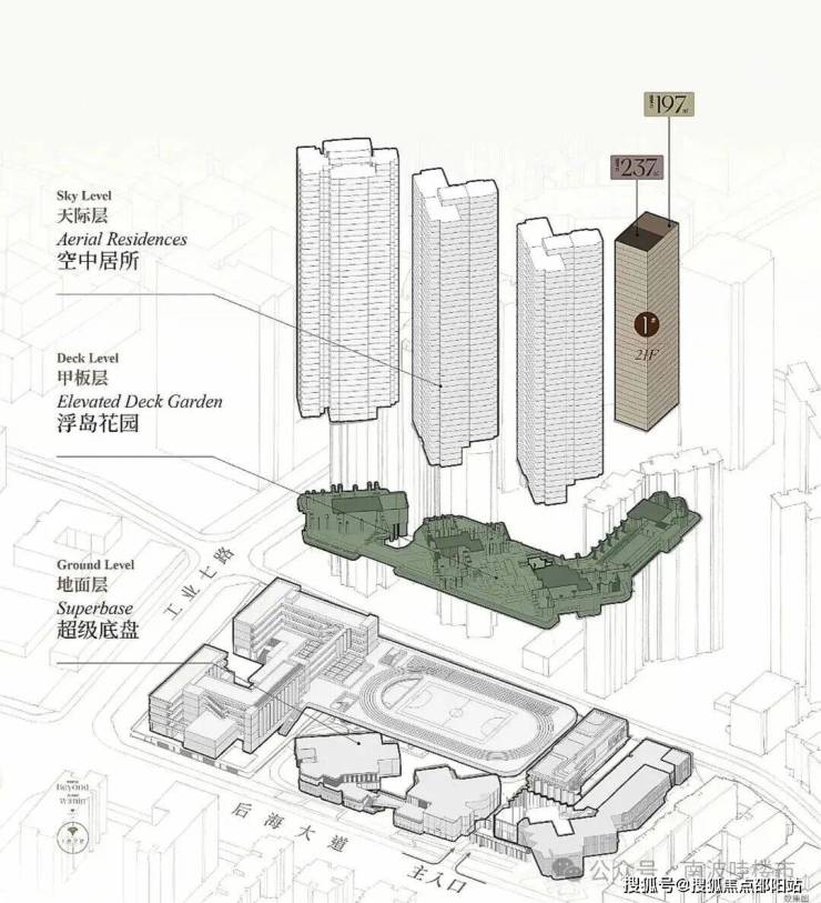 产品力是后海招商玺的核心竞争力,尤其是在顶豪扎堆的后海,没有过硬的产品设计很难脱颖而出。项目最亮眼的莫过于“浮岛甲板”的创新建筑理念,简单来说就是把整个社区抬高了12米,形成“超级社区底盘+浮岛绿化甲板”的双层结构,彻底实现了人车分流和动静分区。下层主要规划了商业、会所、立体花园和公共服务设施,直接与城市道路连通,方便业主日常出行和消费;上层则是纯居住空间,四栋住宅稳稳立在甲板之上,独享空中庭院,私密性和居住舒适度直接拉满。再看归家体验,项目打造了殿堂级的落客区,搭配天幕穹顶和灵动水景,每一次回家都像一场仪式感十足的旅程,这也是顶豪应该有的标配。