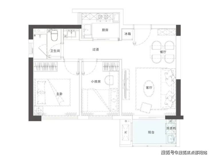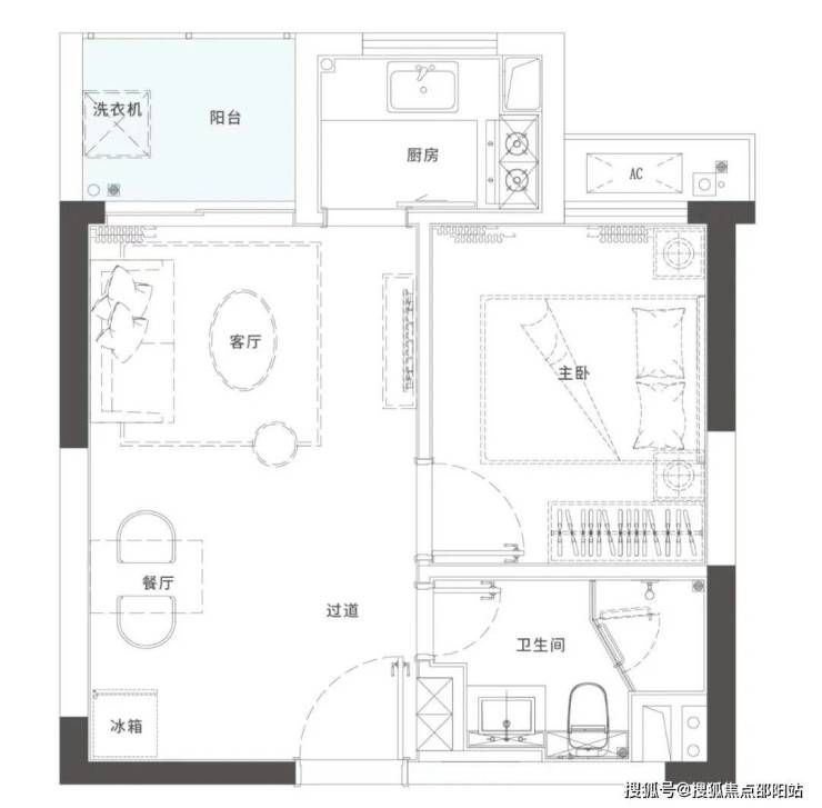 约62㎡ 实现两房两厅一卫功能配置,独立明厨和三分离明亮卫浴,主卧可放置2米双人床,厅出阳台。