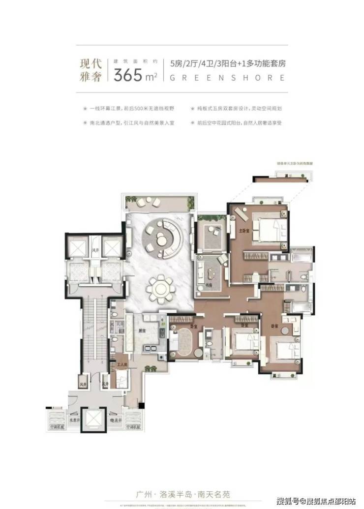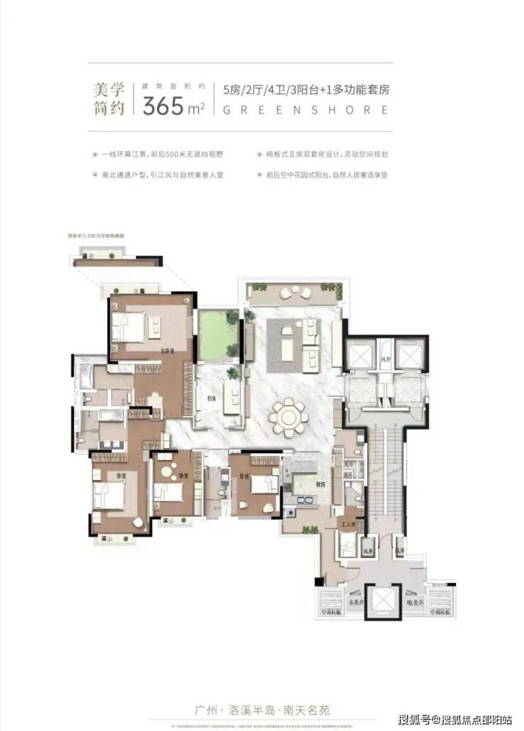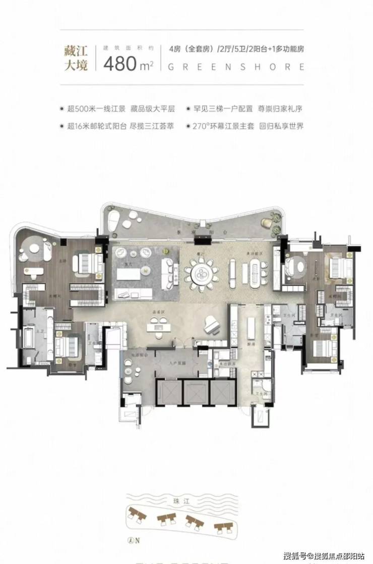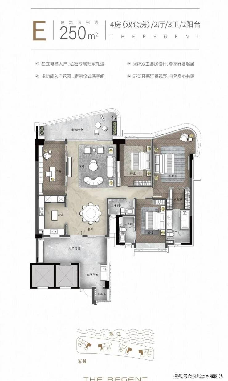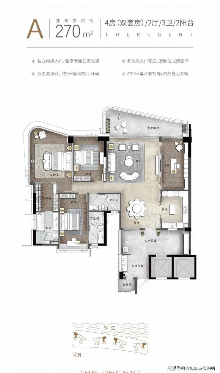 :270㎡户型享9米邮轮式阳台、6米开间客厅,360㎡楼王户型配备独立家政间、双玄关及270°环幕观景台。