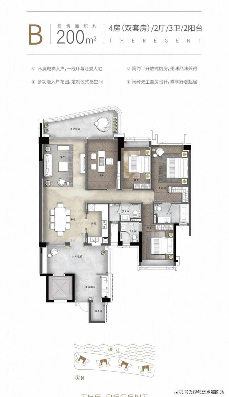 :140-270㎡四至五房,全系4梯3户/3梯2户,专梯专户设计,赠送6-9㎡入户花园,双主卧套房配置。