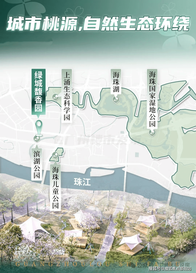从外部来看,项目背靠河涌,打造了一个滨河公园,与周边的海珠儿童公园、海珠湖、海珠国家湿地等,形成了巨大的天然的生态背景板。