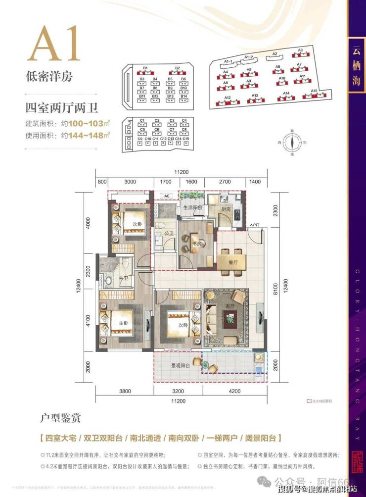 1、A1 100平米四房两卫,使用面积140-148平米