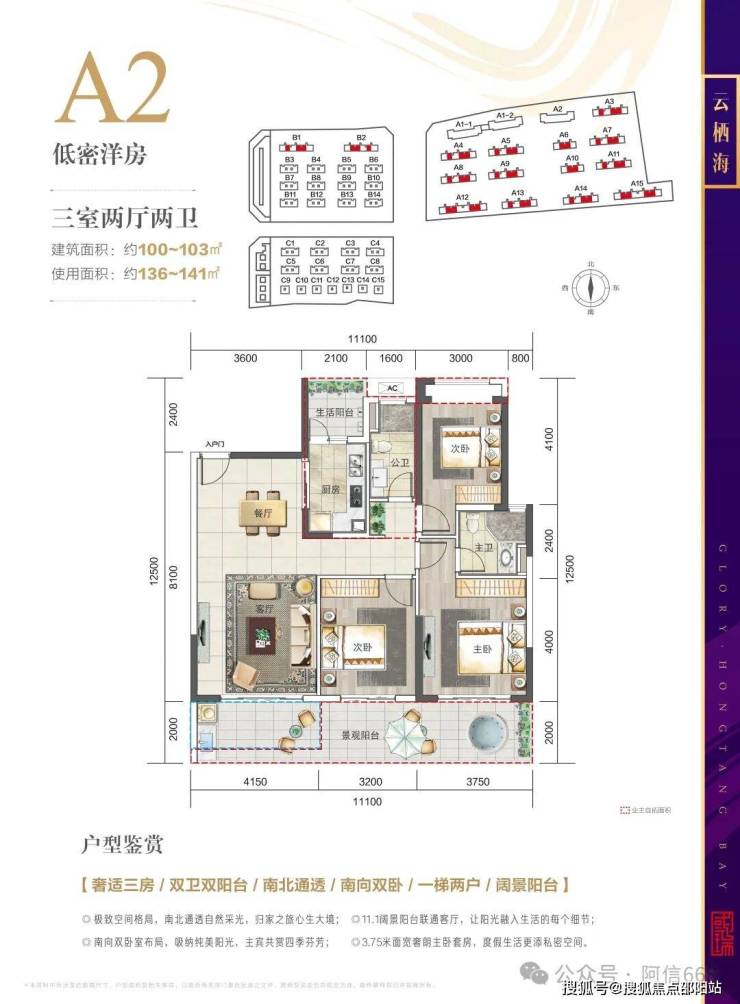 2、A2 100平米三房两卫,使用面积136-141平米