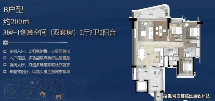 「天启」在寸土寸金的地段,只规划少量楼栋、调整楼栋座向,沿江倾斜15-30°波浪形排开,让大部分单位都能享受270°震撼江景。业主在室内可以近览三江汇聚的壮美江景,远眺CBD的繁华景致。