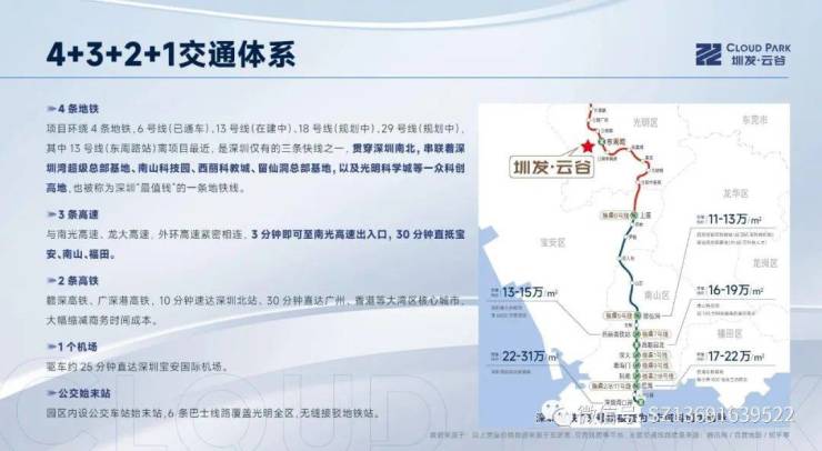 项目环绕4条地铁,6号线(已通车)、13号线(在建中)、18号线(规划中)、29号线(规划中),其中13号线(东周路站)离项目最近,是深圳仅有的三条快线之一,贯穿深圳南北,串联着深圳湾超级总部基地、南山科技园、西丽科教城、留仙洞总部基地,以及光明科学城等一众科创高地,也被称为深圳“最值钱”的一条地铁线。