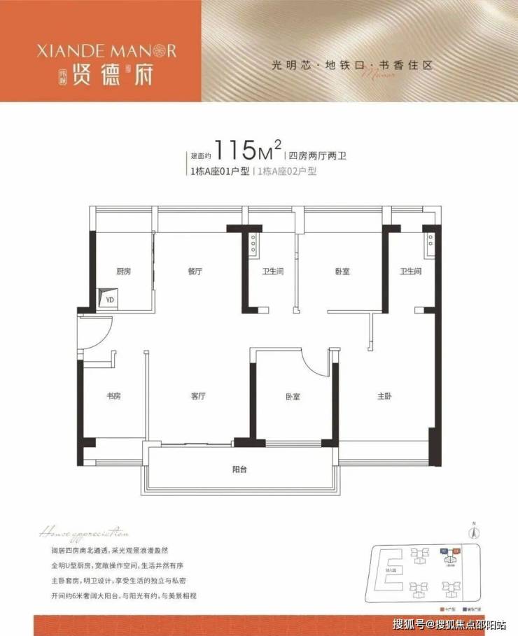 115㎡ 4房2厅2卫 竖厅南北对流、餐客分离,主次卧均带飘窗、最大化延伸居住空间,超大阳台拥有更佳的采光和景观视野。