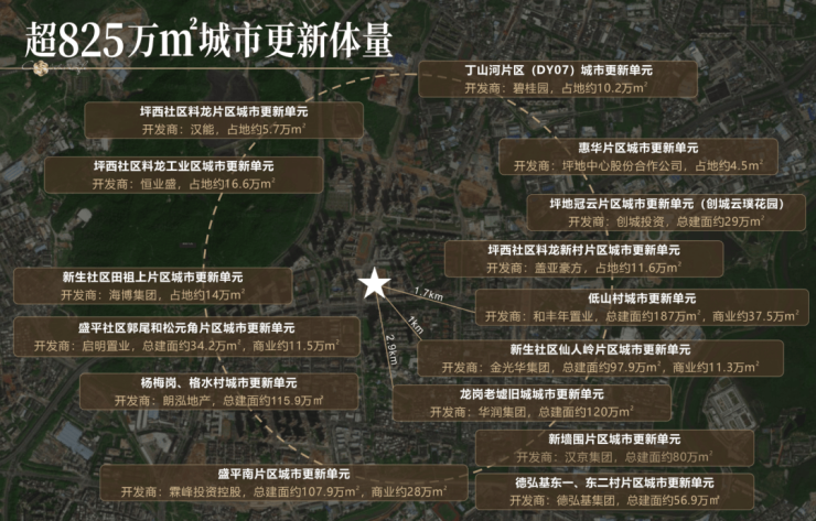 周边约5公里规划约15个城市更新项目,超825万㎡体量,其中商业超88万㎡,云集华润、金光华、汉京和光大等知名品牌开发商进驻,约1400亿城市更新红利,引领区域蝶变升级。