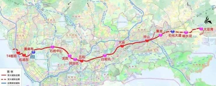 全线设地下站11座,分别为T4枢纽、机场东、黄麻布、石岩中心、龙胜、民治北、五和、白坭坑、大运、坪山、聚龙,预计 2026 年建成后,坪山至深圳机场最快仅需 40 分钟