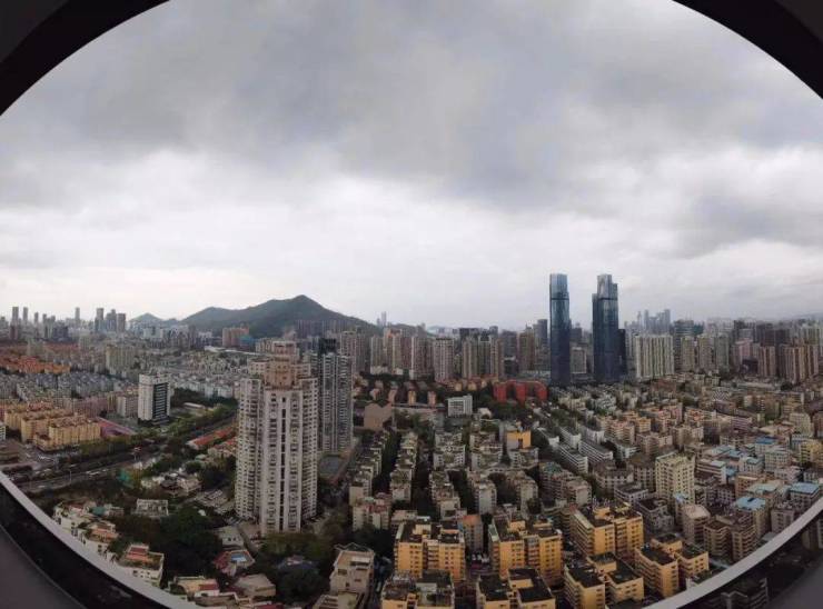 整栋建筑高 150 米,呈现 L 型布局,外立面是全玻璃幕墙设计,最大程度地保证了每一户的通风、采光与景观面,更是将山海城的景观视野做到了完美演绎。