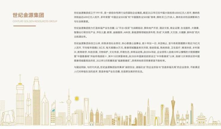 世纪金源成立于1991年,是一家综合性跨行业的国际企业集团。截至2022年已在中国大陆投资4000亿元人民币,缴纳各项税金近600亿元人民币,多年荣登“中国企业500强”和“中国服务业500强”榜单,拥有员工2万余人,具有良好的品牌影响力与社会美誉度。