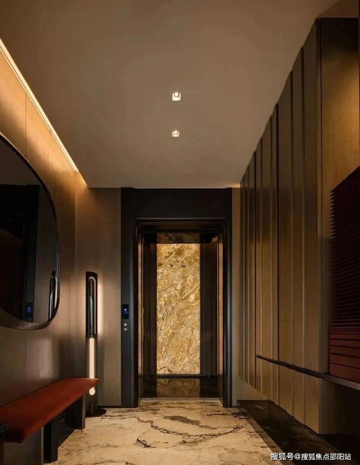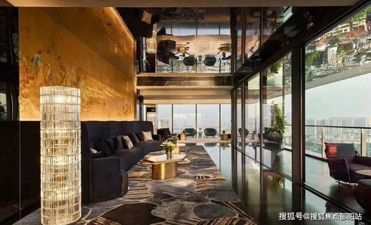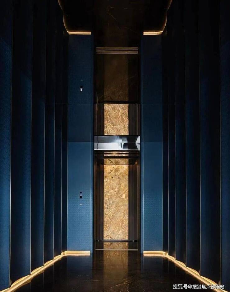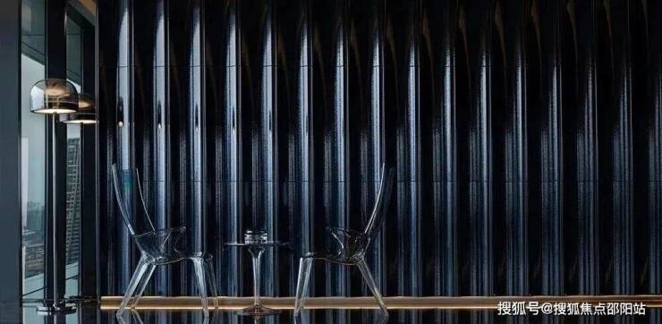 项目以“天际悦享荟”为核心社交空间,位于顶层,拥有270度全景视野,尽揽珠江壮阔与城市繁华。设计团队将“三江汇聚”的意象融入空间叙事,以超薄透光天然石与定制水波状木饰面,营造静谧光影与流动水韵的对话。胡桃木饰面搭配宝格丽黑石点缀,脚下卡慕白石纹理呼应岭南山水,红色长凳成为视觉焦点,赋予归家仪式感。蓝色陶瓷波浪墙、黑色镜面不锈钢天花与宝格丽黑石地面形成现代诗意的水韵意境,鎏金光晕延伸展开,彰显轩昂气度。
