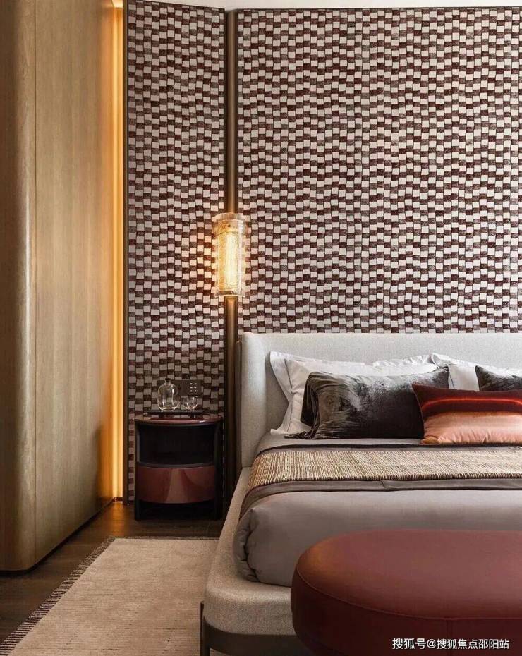 以“四房两厅四卫”布局,三面环江,270°环幕江景与客厅波浪肌理墙面相呼应。主卧采用米白与原木色基底,红白格纹艺术墙纸与红色床凳点亮空间;浴室面向江景,宝格丽红奢石彰显尊贵。以L形露台为特色,超30米露台串联客餐厅,形成“江景会客厅”。阿凡达绿奢石电视墙划分空间边界,开放式中西厨与双餐厅设计,让烹饪成为家庭互动核心。