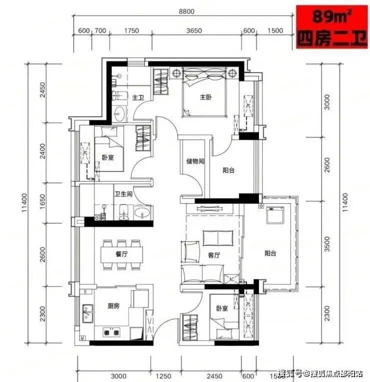 B02户型:89㎡四房二厅二卫