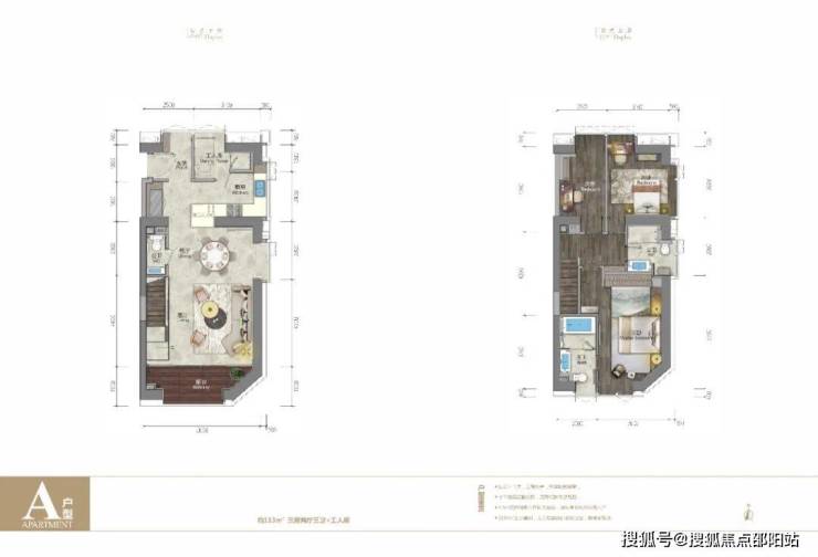 A 户型是一个面积约 113㎡ 的复式三房,拥有开阔的视野,室内设计将现代极简主义设计风格与轻奢质感恰到好处的融合,塑造出了一个高阶品质空间。