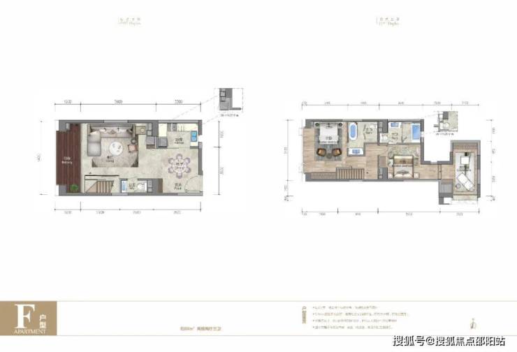 F 户型面积约 88㎡,是一个两房两厅三卫的布局,同其它户型一样,楼下规划出客厅、餐厅、厨房及卫生间,楼上则是双主卧套房。