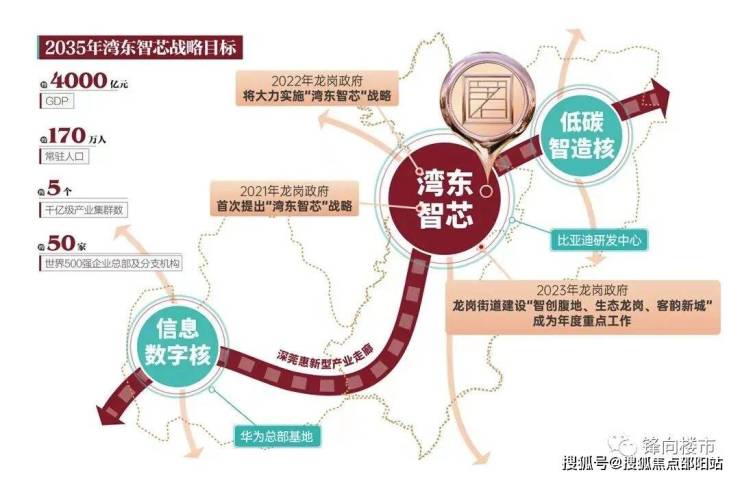 2023年龙岗政府发布“湾东智芯”战略,明确于2035年将实现约4000亿GDP总值。以“一芯”“两核”、“多支点”驱动发展,龙岗中心城正位于“一芯”之内,未来将成为集科创、行政、文化、商业、交通于一体的深圳东部新中心。