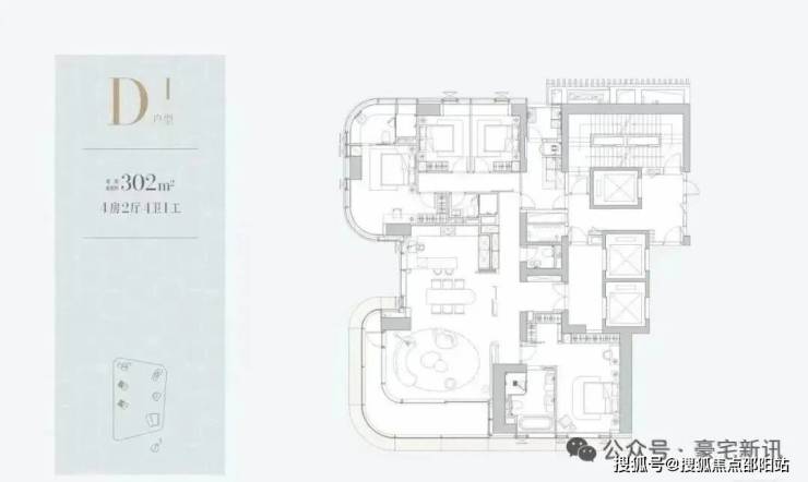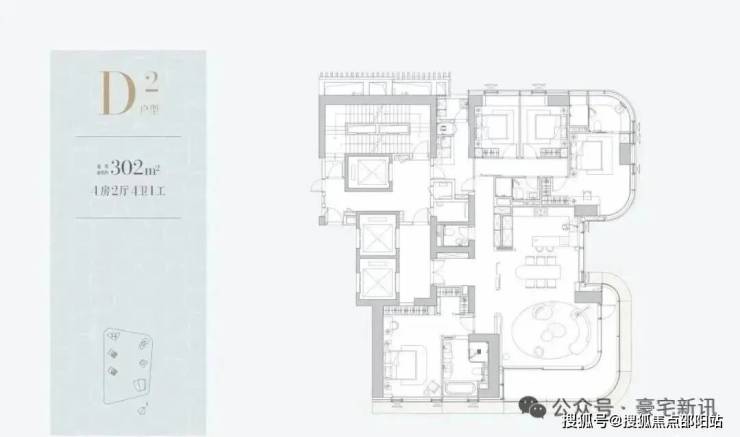 1D栋(1栋四单元)-45层:均为3梯2户,约302㎡,一层两户。
