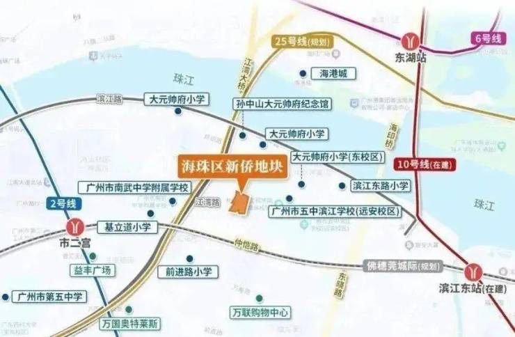 1 公里内有大元帅府小学(市一级)、滨江东路小学、广州市第五中学(省一级)等,配建幼儿园规划中,但优质公立小学对口尚未明确,存在一定不确定性;