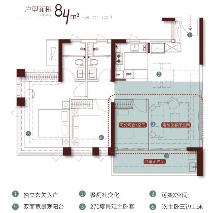 四开间朝南保障采光通风,开放式LDK+U型厨房,美观实用。客厅连接X空间,5.4米开间结合双面宽阳台,打造开阔通透公区。