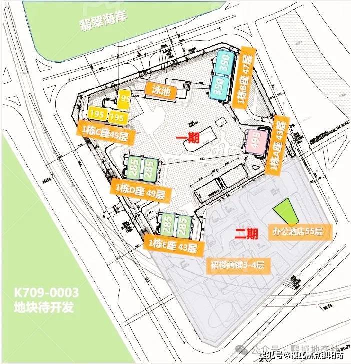 此外,酒店、办公和商业面积分别为40000平方米、25570平方米和15000平方米,这些设施属于项目的二期工程,预计将在一期住宅建设完成后开始施工。酒店办公楼栋高达55层,而商业部分多为3至4层高,基本不会对海景造成遮挡。