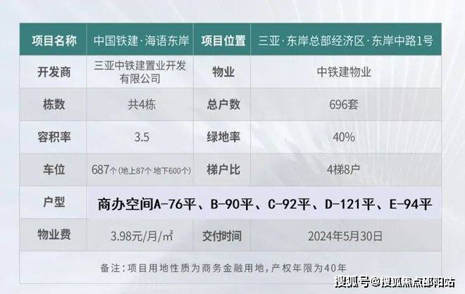 中国铁建·海语东岸项目地块由千亿央企、世界500强企业中国铁建斥资49650万元,于2019年12月摘得,总占地约28.55亩,容积率3.5,绿化率40%。项目规划4栋楼,4梯8户,共692套,户型为建面约76-92㎡的两房吉-121㎡的三房,统一由中铁建物业管理,物业费为3.98元/月/平方米,40年产权,精装修,预计2024年5月30日交房。