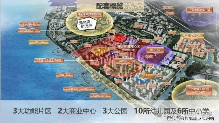 平沙新城:总规划15.5平方公里,定位为商旅服务中心和游艇娱乐中心,规划结构突出为“一核、双心、四轴、六区”。