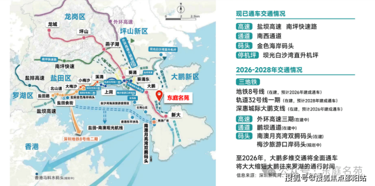 大鹏新区地铁8号线二期目前已经开通到小梅沙,未来三期接 32 号线,一路向西铺设至葵涌。另外在建的深惠城际大鹏支线,线路全长 39.5 公里,共设龙城站、坪山站、燕子湖站、葵涌站、大鹏站、新大站6座车站,预计2026年后通车,大鹏站都离项目约5分钟车程(约800米)