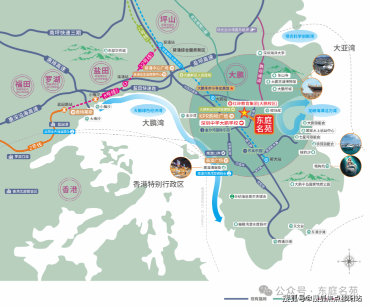 东庭名苑位于深圳东南部的大鹏新区。新区三面环海,东临大亚湾,与惠州接壤,西抱大鹏湾,遥望香港新界,是粤港澳大湾区城市群的重要节点之一。