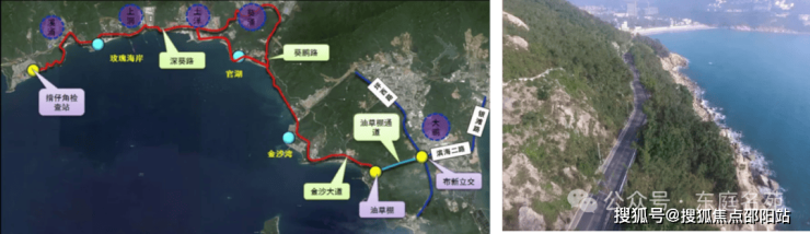 从项目出发通过迭福路——坪西路——惠深沿海高速——滨海大道实现 50 分钟可达罗湖中心 ,一小时可达福田中心。环大鹏湾海岸公路总长25.5公里。沿途的美景有揹仔角沙滩、玫瑰海岸、新 兴的民宿小镇官湖、金沙湾等。因一路山海美景被誉为“深圳最美公路”。