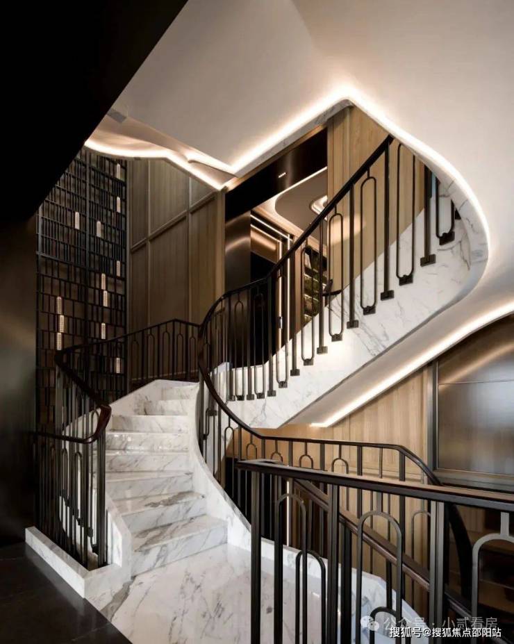 从6.6米挑高的背景墙,到每层空间的阶梯,一砖一墙,皆采用天然大理石,加上人工精细打磨而成。