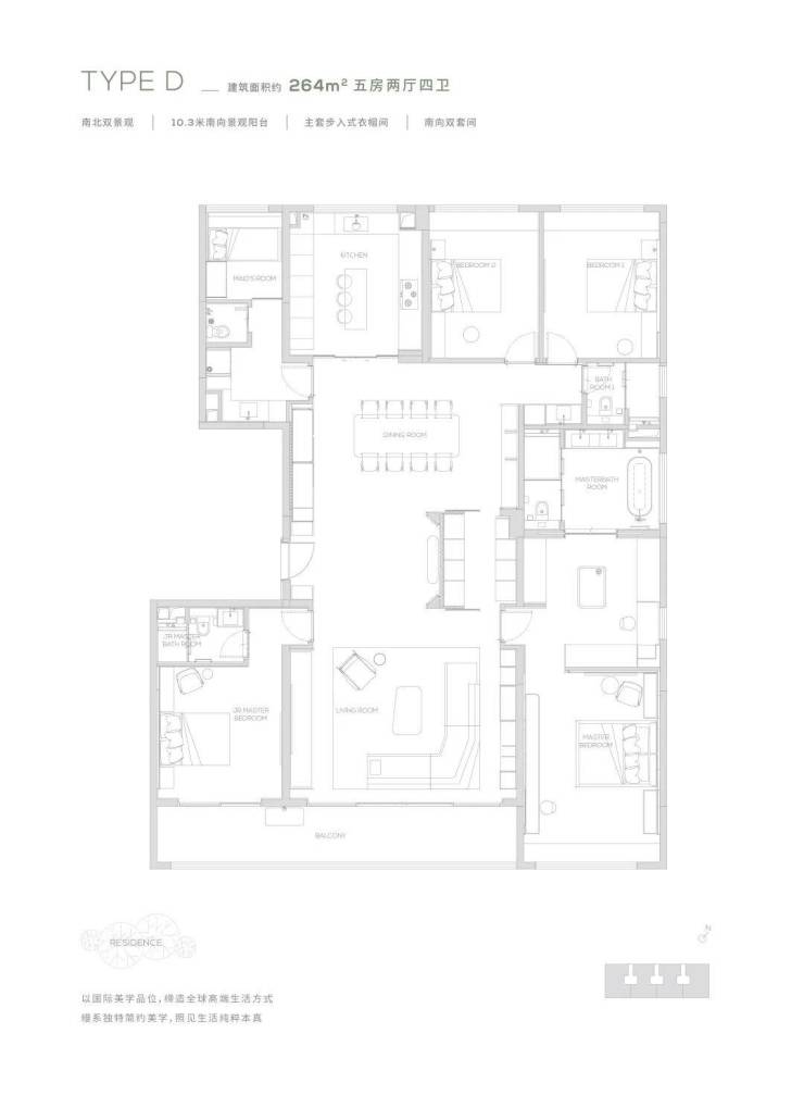 【264㎡户型】10.3米南向景观阳台-南北双景观-主套步入式衣帽间-独创灵动岛设计,生活场景多重切换