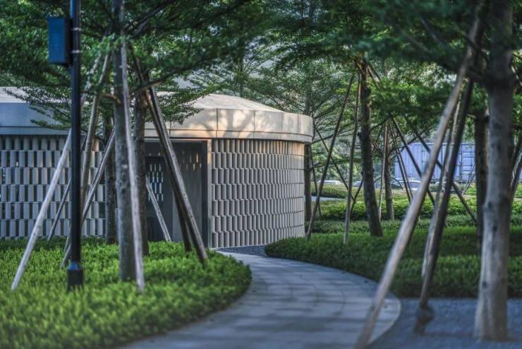 合院采用岭南设计风格,270°风光围合,用石材铺装,以草坪加灌木、乔木的方式创造出了多重立体植物的庭院空间,以石柱、月洞门等景观小品加以点缀。