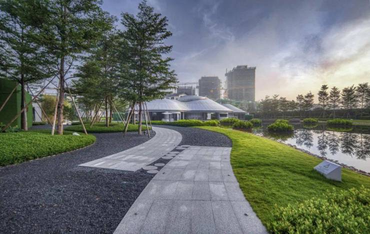 在展示中心入口处设计起伏的白色山丘,先抑后扬的白色玻璃景墙和白色接待厅用来告别熙来攘往的喧嚣,选择白色和绿色来纯净画面。