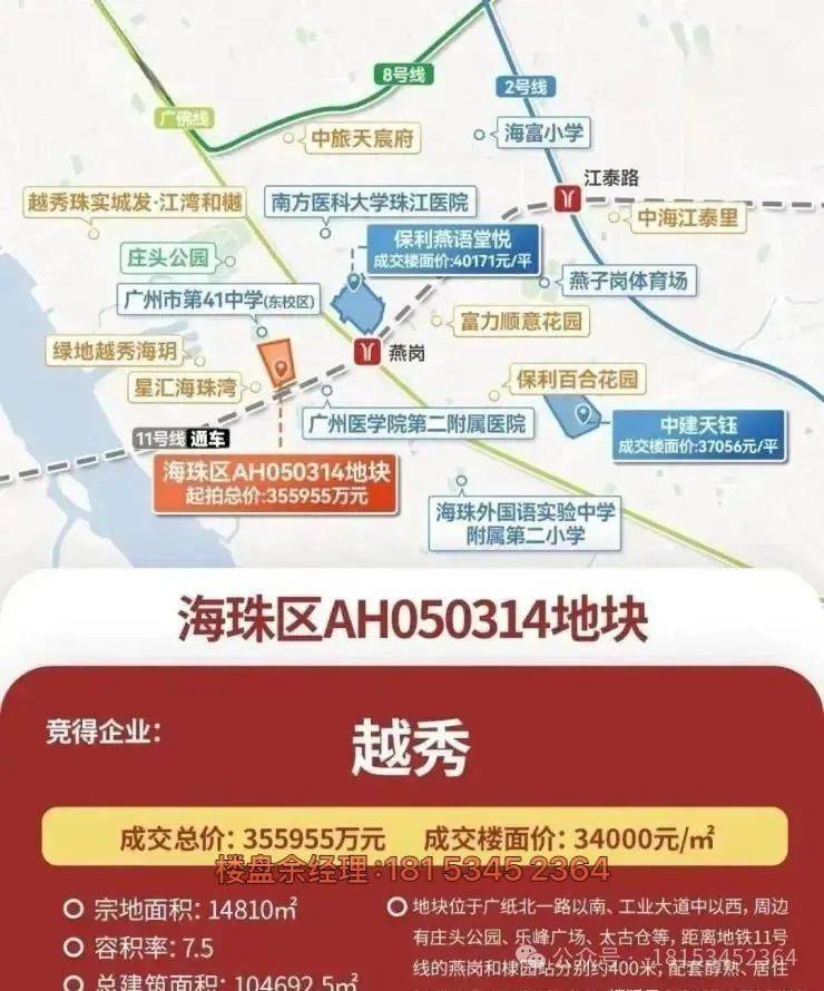 越秀熙悦江湾位于海珠西广纸成熟板块,这块地是越秀在2024年9月份拿下的314地块,楼面成交价约3.4万一平。