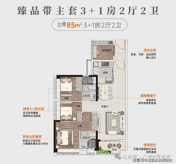 建面约85㎡ 4房2厅2卫,双次卧带飘窗,使用率达至新高