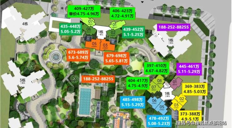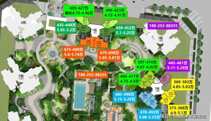 这种户型分布在1栋一单元,东北和西北朝向,主卧看花园,价格区间在406-427万。