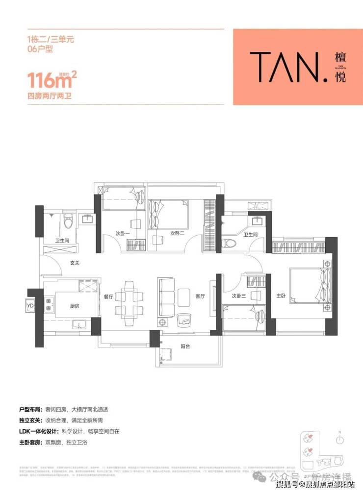 116平:4房2厅2卫,南北通透,使用率74.34%(不包含赠送面积)