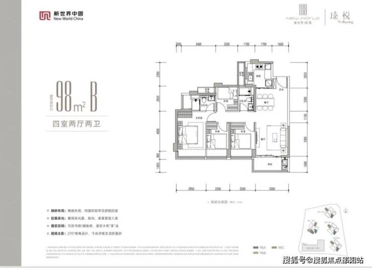 98㎡的4房2厅2卫(AB户型),设计的是竖厅格局,客厅3.3米开间,LDKB一体化设计,动静分区,四开间朝南,分别做到了主卧15.23㎡/次卧8.8㎡/7.85㎡/次卧7.3㎡(包含墙体飘窗),U型厨房,卫生间干湿分离,同时带1个设备阳台约1.38㎡,阳台约5.28㎡西南或东南朝向。