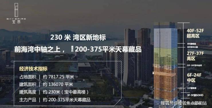 华侨城宝辰总高230米,为宝中最高楼;项目52层,分为中区、高区、超高区,6层起卖,11、39F为避难层,25-26F为空中会所,28F为空中大堂。除了空中大堂项目还有地下入库大堂+首层大堂,一共三重大堂。