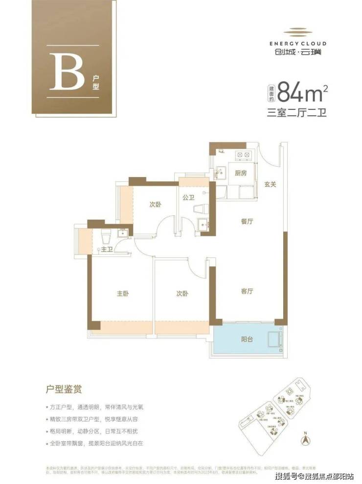 采用餐客厅一体化设计,动线更合理;主卧套房、次卧、阳台三个采光面一字排开,更通透。
