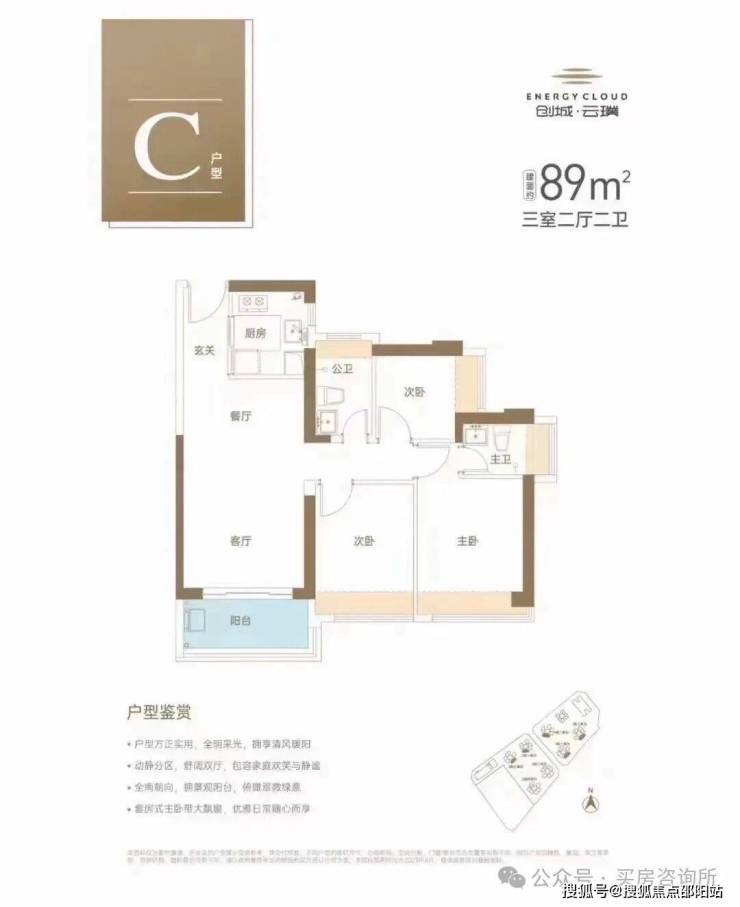户型方正,动静分区明显,客厅外就是阳台,便于采光通风、观景。